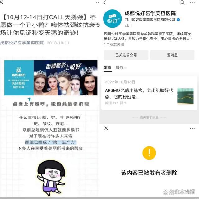 不过,北京商报记者发现,这些文章目前均已被删,美莱公众号的第一篇文章始于2022年4月。目前伊美尔公众号的第一篇文章发表于2020年,成都悦好医学美容医院的第一篇文章发表于2022年。